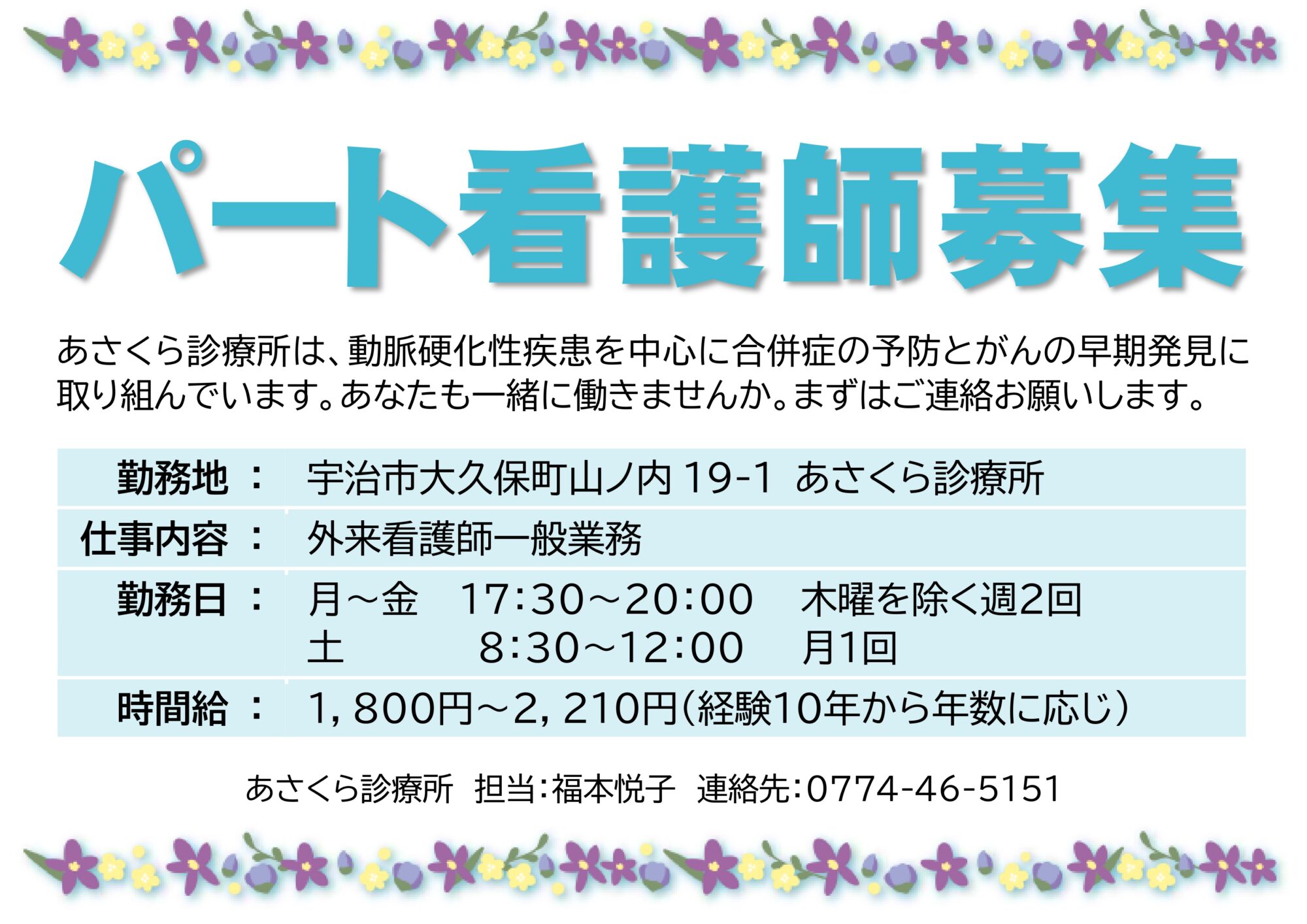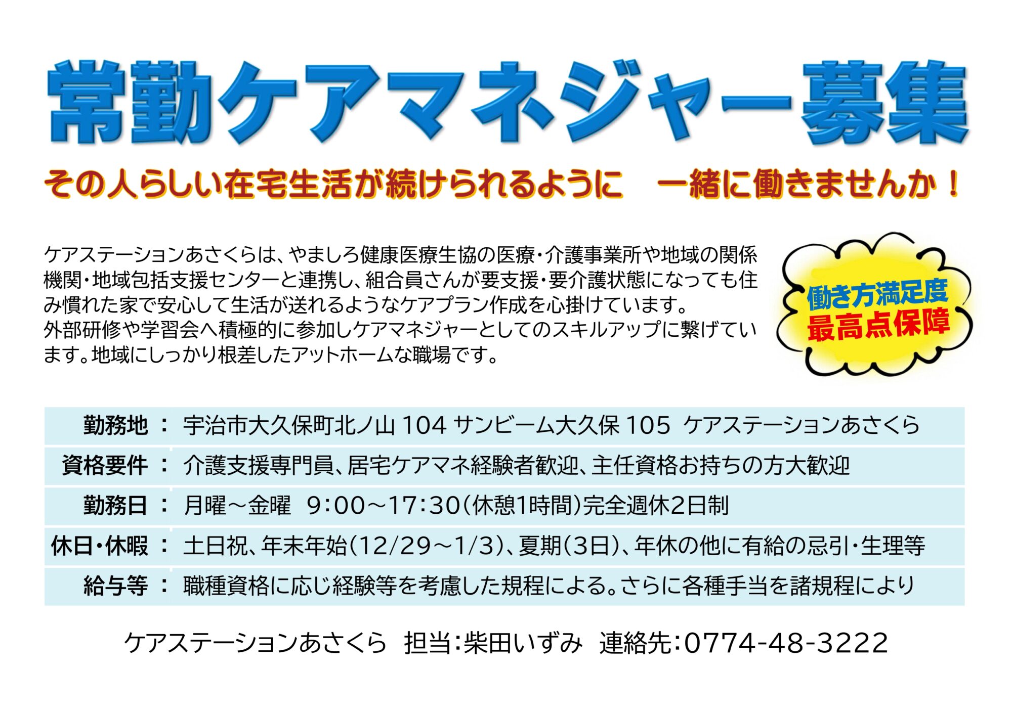 「パート看護師・常勤ケアマネージャー募集」案内を掲載しました