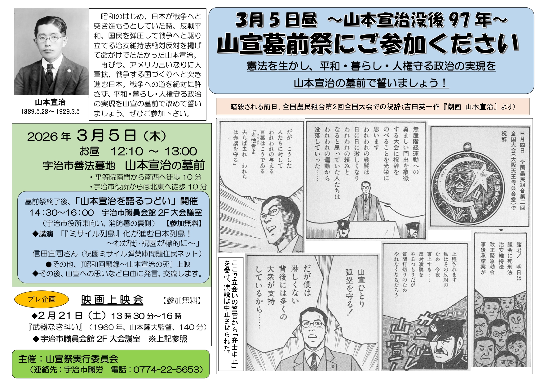 人々が慣れ親しんで「山宣」と呼んだその人は、宇治川のほとりにある料理旅館「花やしき浮舟園」の若主人でもあった人で、宇治の町では毎年彼の命日である3月5日、善法の墓地で「山宣墓前祭」をひらき、平和と民主主義を守るために死んでいった故人をしのび、彼の意志を受け継ぐことを誓い合う集いを持っています。
